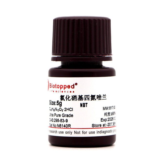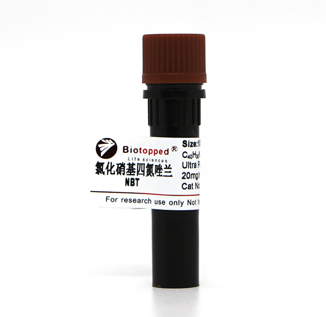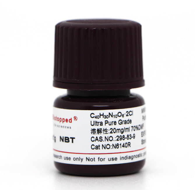氯化硝基四氮唑蓝 (NBT;N6140-Biotopped): 脱氢酶和其它过氧化酶的底物。用于测定葡萄糖-6-磷酸脱氢酶(glucose-6-phosphate dehydrogenase);也是凝血因子I(fibrinogen)的沉淀试剂。也是碱性磷酸酶底物之一,在碱性磷酸酶的催化下生成不溶性的蓝色产物。常用于免疫组化(IHC)、免疫细胞化学(ICC)和蛋白印迹(WB)等实验。NBT可作为一种筛查尿道感染的方法。氯化硝基四氮唑蓝(NBT)还原法对血清糖化低密度脂蛋白及极低密度脂蛋白(SG LP-V P)进行测定,依据呈色的深浅直接用光密度表示SG LP-V P的浓度,并计算SG LP-V P的指数,取得的效果非常好。
