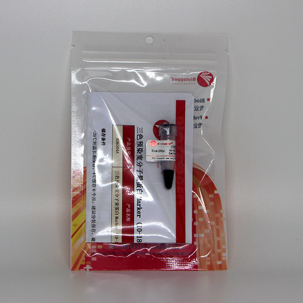 本产品由跨度从10~180 kDa的10种纯化的天然蛋白混合而成,各条带浓度约为0.2~0.4 mg/ml。其中75 kDa条带为红色预染条带,方便判断各个条带的准确位置。本产品适合作为SDS-PAGE电泳时,变性蛋白样品的分子量参照,并可实时观察蛋白样品的电泳分离状况,也可用于检测Western blot的转膜效率。由于共价结合的染料会影响蛋白质分子的电泳迁移率,本产品适于粗略地估计目的蛋白样品的分子量。